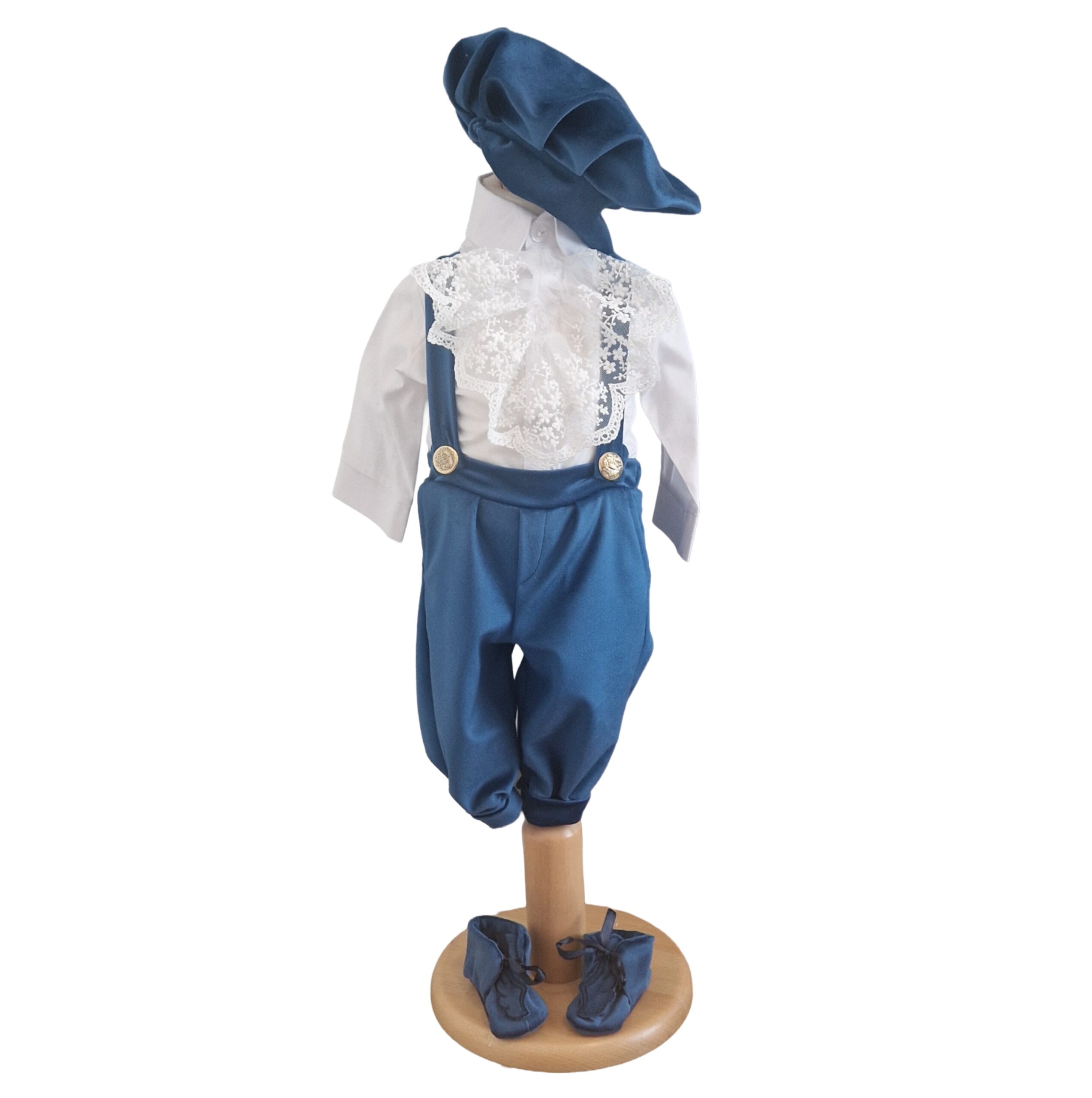 Este compus din: Sacou din catifea cu aripi detasabile la spate, Camasa din bumbac cu guler medieval, Pantaloni din catifea cu bretele moderni si comozi, Bascuta asortata, Pantofi asortati.