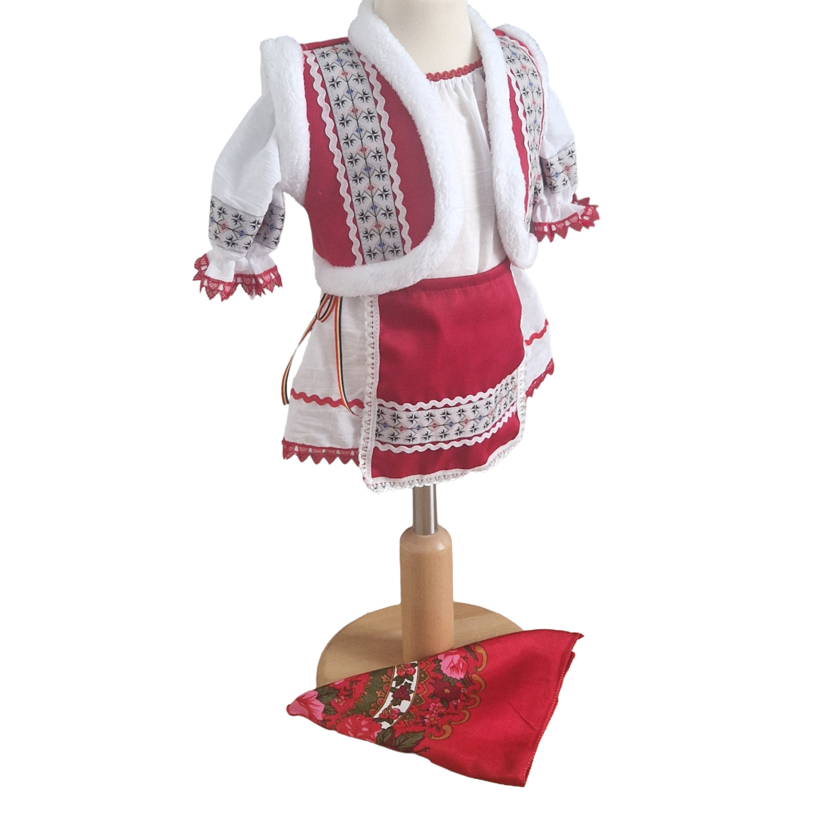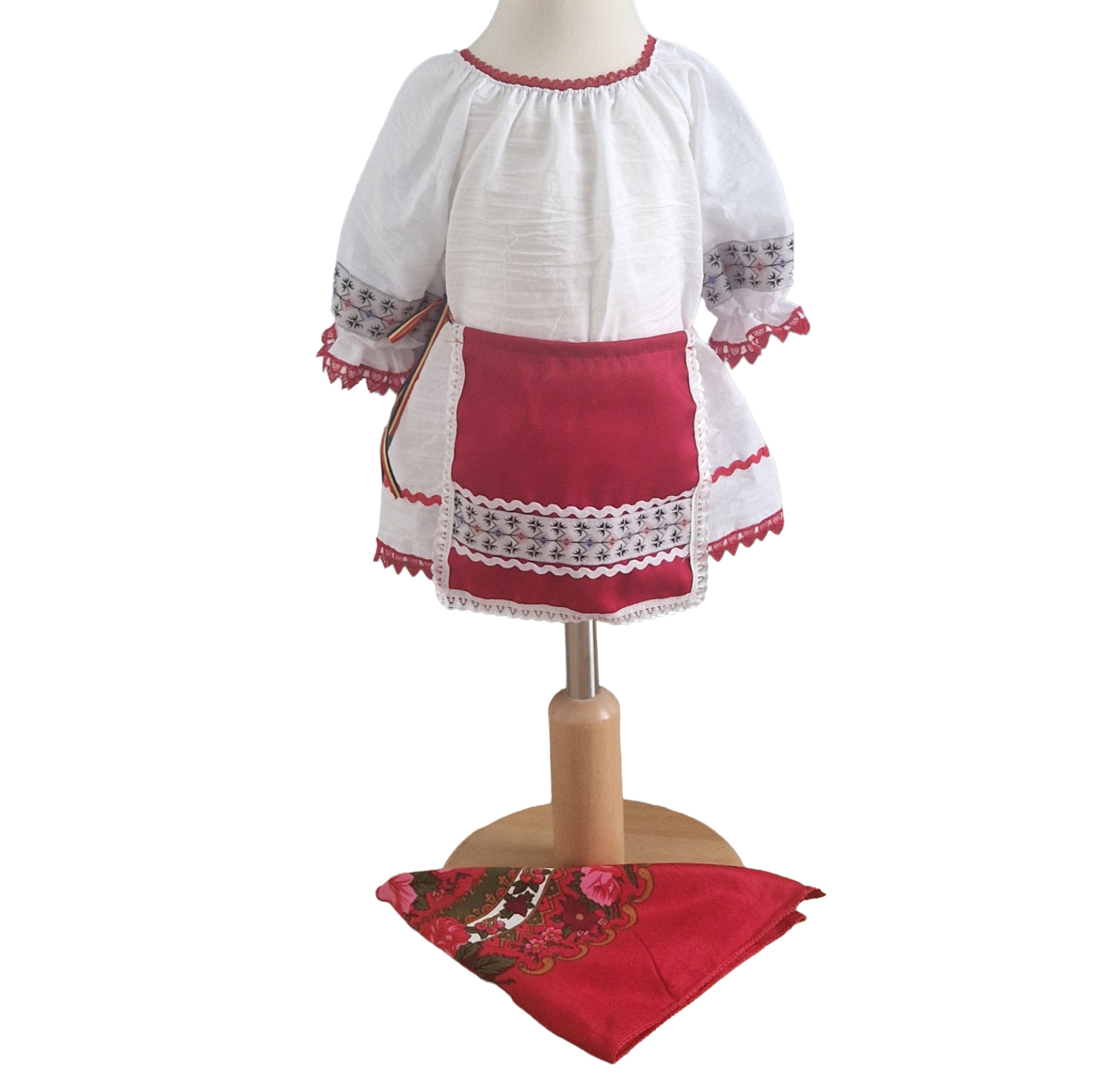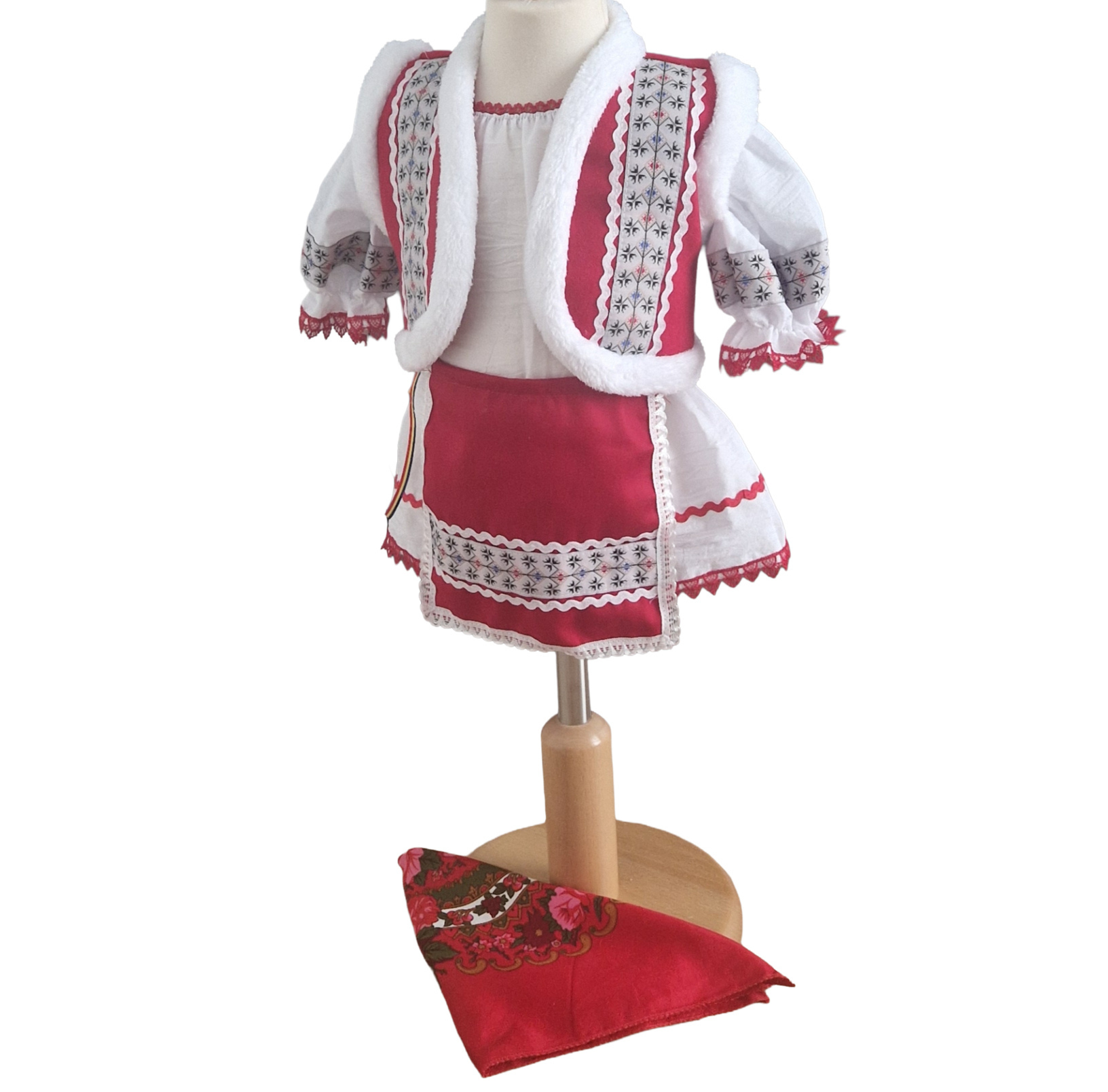 Șorțul roșu decorativ și broderiile subtile evidențiază specificul etno, oferind rochiței un aer festiv și deosebit. Setul este completat de un batic asortat, care întregeste look-ul tradițional și adaugă un plus de farmec.