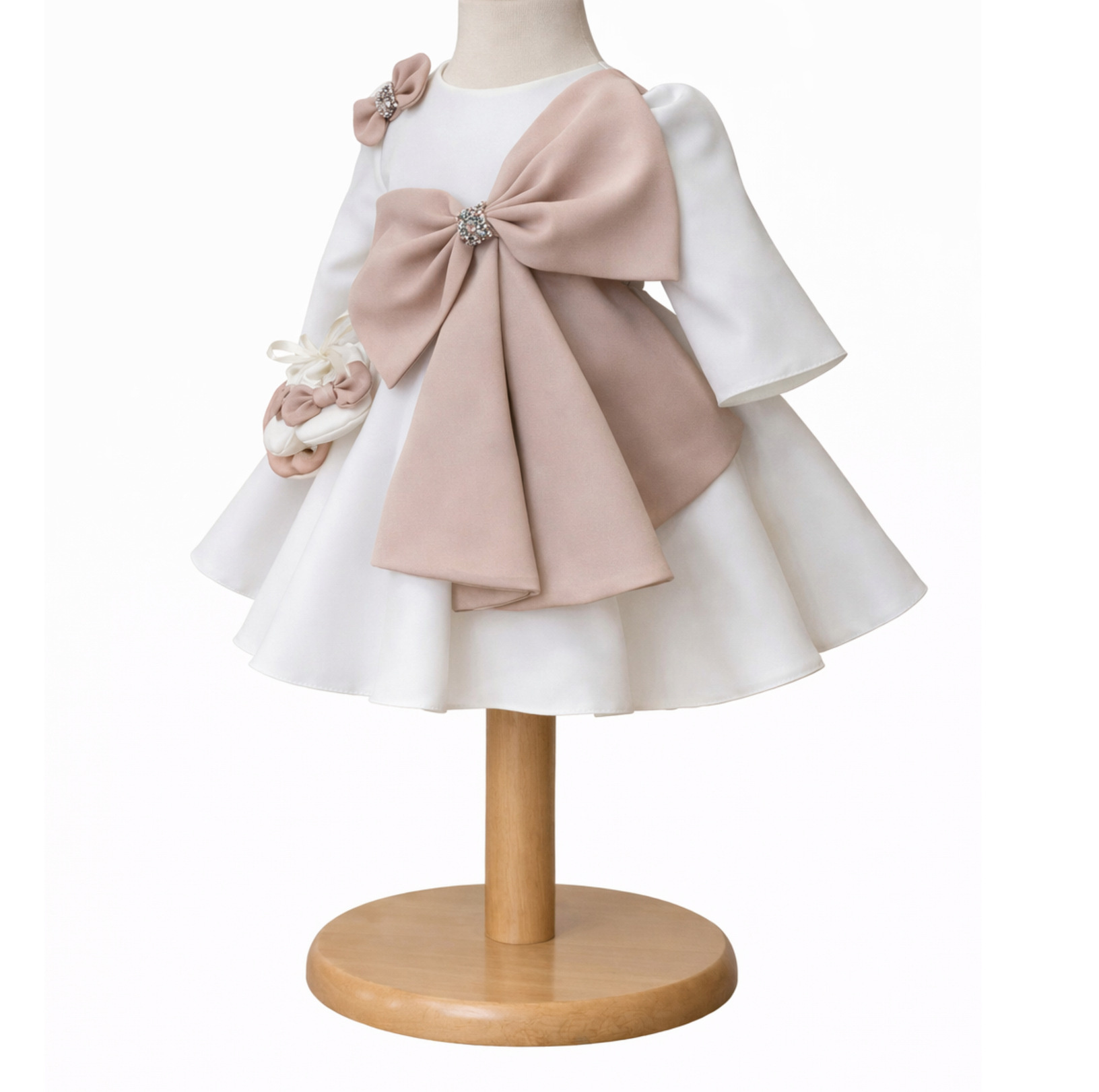Rochie botez fetiță albă cu fundă bej – Barbie este alegerea ideală pentru un eveniment special, oferind un mix perfect între eleganță, rafinament și confort.