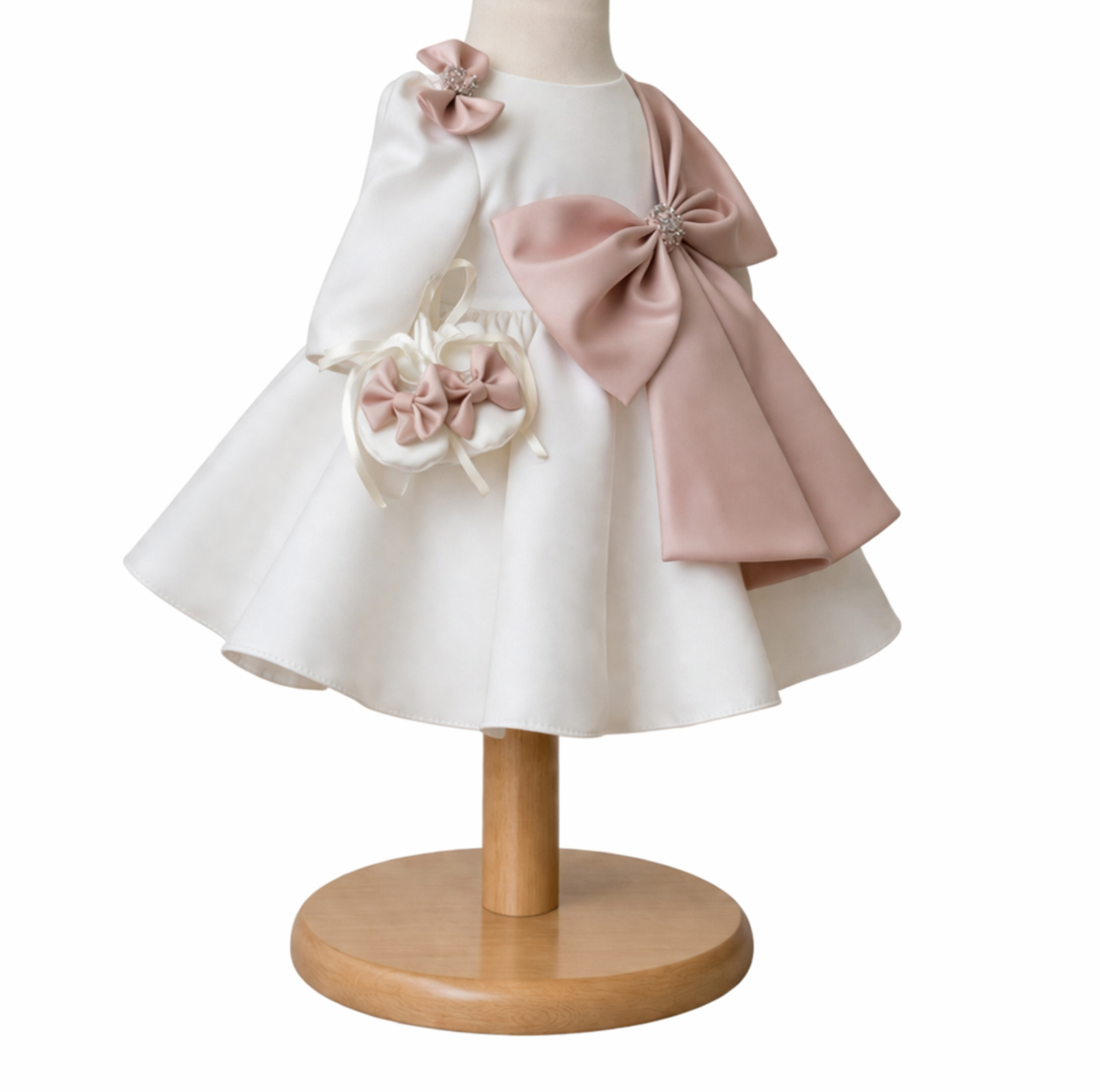 Este o ținută elegantă și delicată, realizată din material fin, cu detalii rafinate și croială amplă. Căptușită cu bumbac pentru confort maxim, rochița vine însoțită de balerini asortați, fiind alegerea perfectă pentru un look complet și deosebit în ziua botezului.