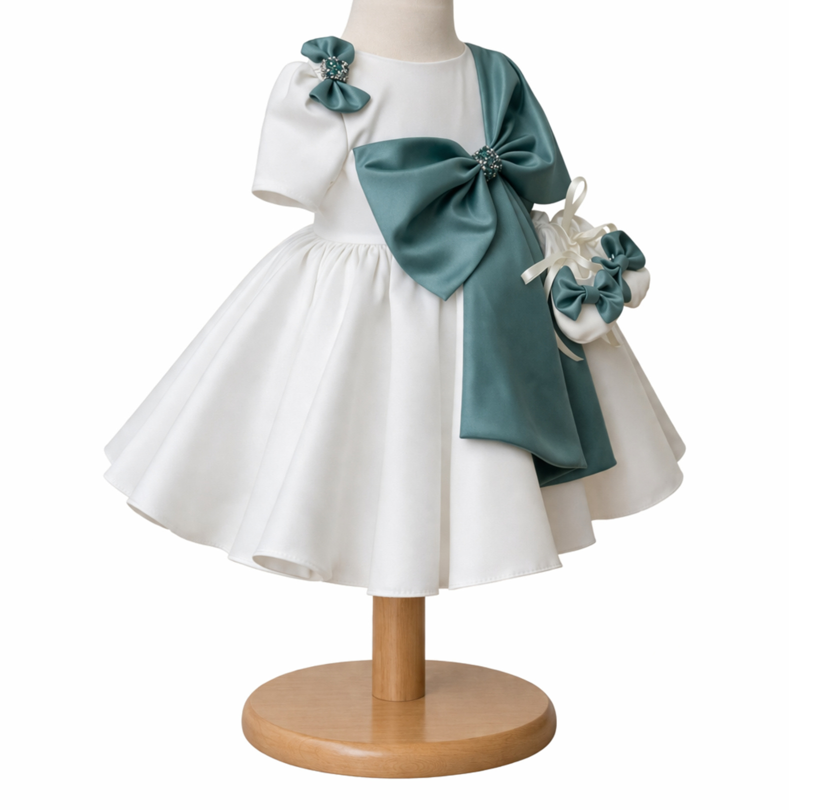 Rochita botez fetiță albă cu fundă verde – Barbie este alegerea ideală pentru un eveniment special, oferind un mix perfect între eleganță, rafinament și confort.