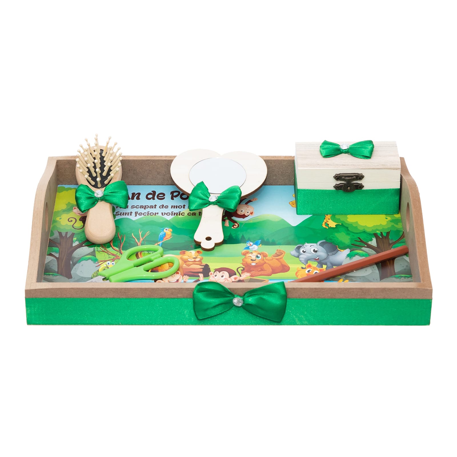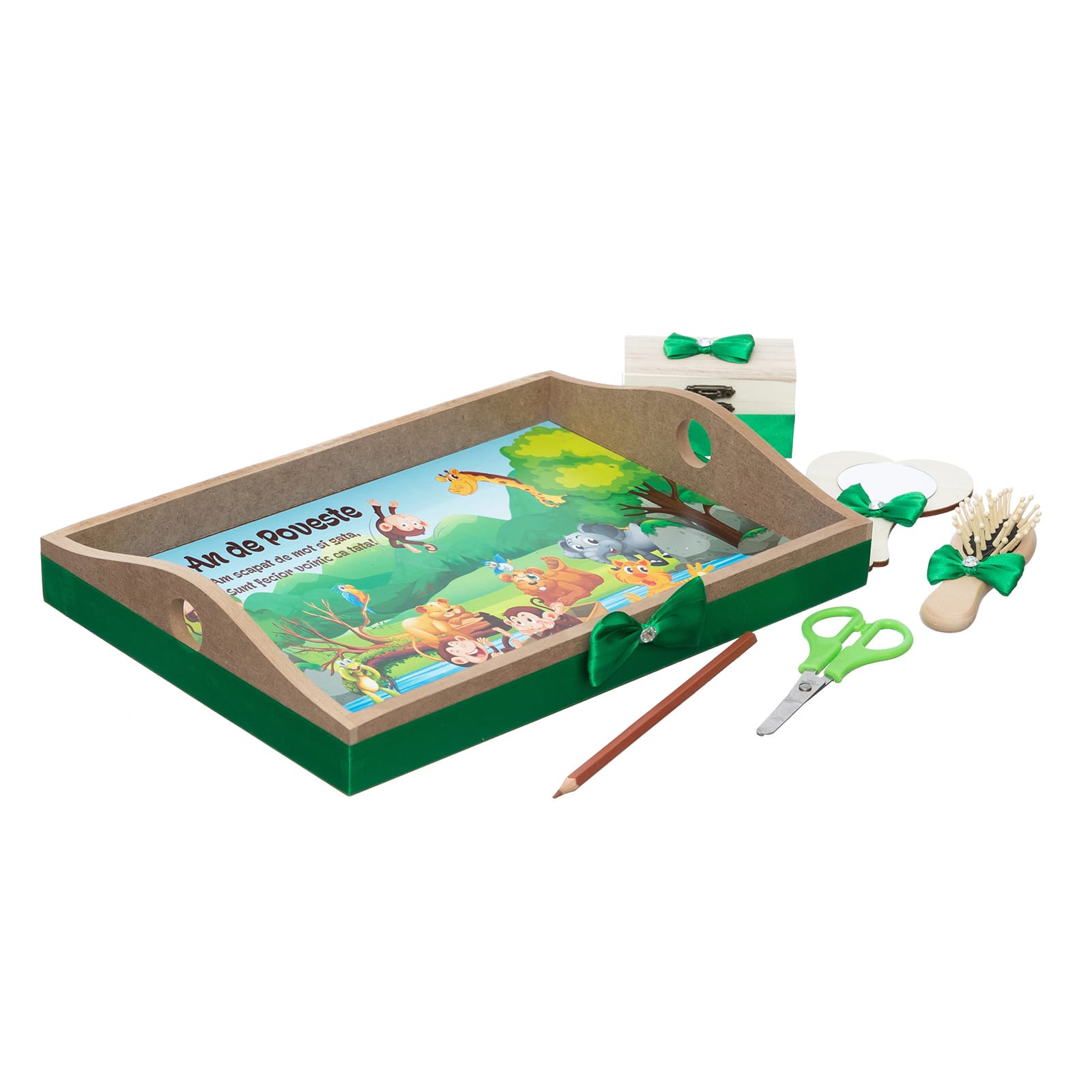 Copilul isi poate alege obiectele de pe tavita personalizata cu numele si personajul preferat. Motul il va pastra intr-o cutiuta, iar celelalte accesorii ii vor completa amintirile.