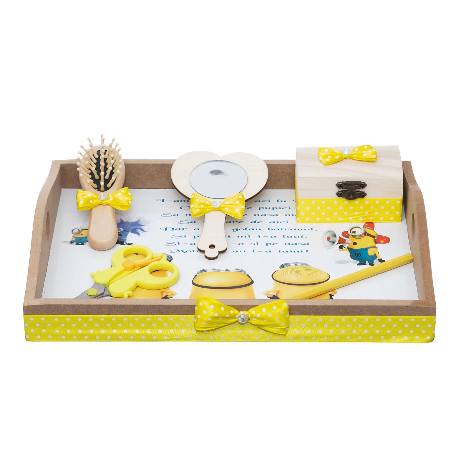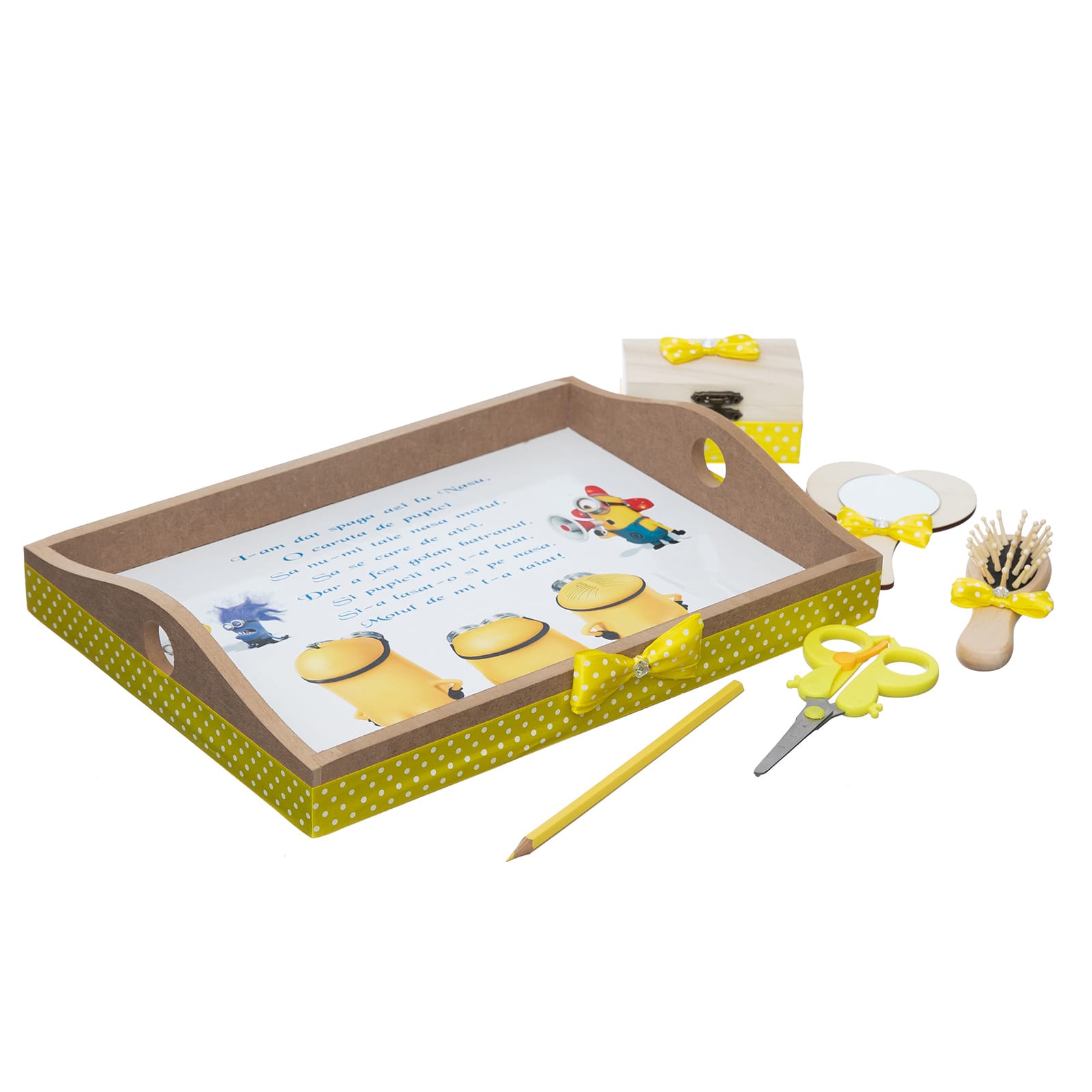 Copilul isi poate alege obiectele de pe tavita personalizata cu numele si personajul preferat. Motul il va pastra intr-o cutiuta, iar celelalte accesorii ii vor completa amintirile.